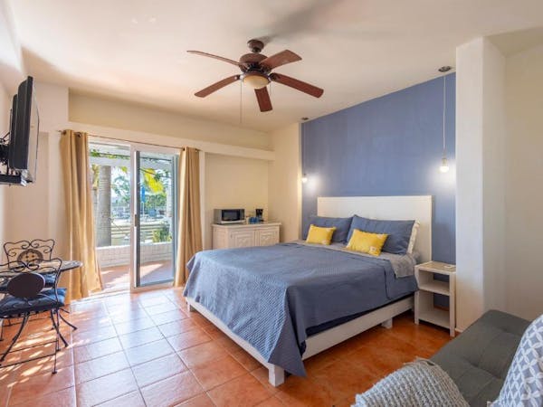 The suite features a balcony overlooking the Gulf of California, minibar, coffee maker and microwave. The bathroom is private and has a shower. A flat-screen TV with cable is included, and Roku streaming TV is available for free upon request. This room has a king-size bed.
